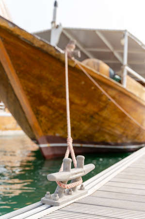 Qatar traditional dhow tied on a metal pier or dock post or steel mooring bollard pole on a pier