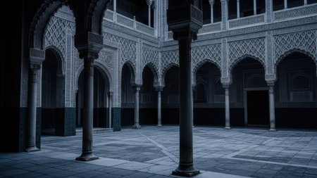 A detailed and serene courtyard showcasing intricate Islamic architectural elements, including ornate arches and columns, set against a dimly lit background.