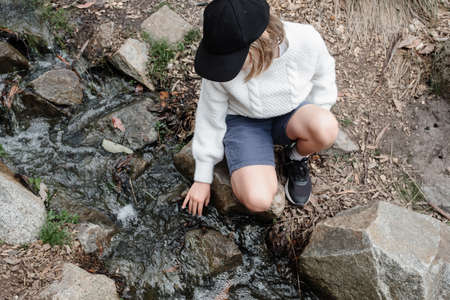 Beautiful mountain creek with rich flora in forest. Conifers and stone with lichens in water stream of mountain creek in sunlight. Atmospheric landscape with small river among thickets in sunny light.