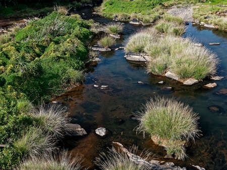 Scenic nature background with lush grasses and flowers near small mountain stream with clear water. Beautiful wild flora of highlands in small river. Idyllic nature scenery. Rich alpine vegetation.