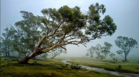 River red gum in a storm, heavy rain pouring down, strong winds twisting their leaves