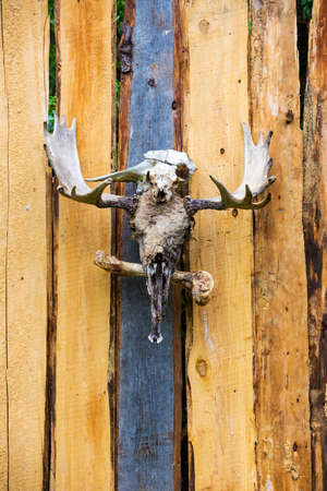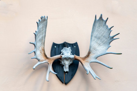 The big horn of an elk strengthened on a wall as a detail of an interior.