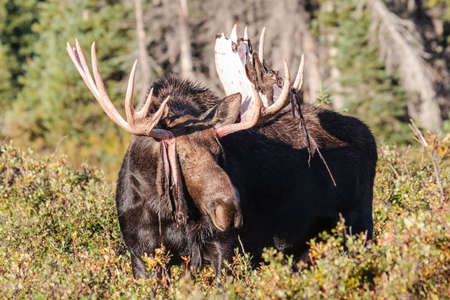 A large Alaska Yukon moose takes a rest after rubbing the velvet from the antler rack.
