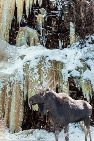 Ice streams of a frozen waterfall fall from a steep cliff in the forest. Elk is ready for the New Year in a snow-covered forest. The concept of exotic and photo-tourism