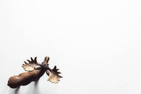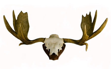 Big moose antlerfrom the North of Sweden mounted on wooden plate,isolated over white.