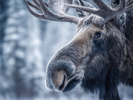 A striking winter image featuring a frost-kissed moose with intricate antlers and textured fur, set against a softly blurred snow-covered forest backdrop.