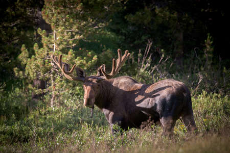 Large bull moose with antlers in full summer velvet walking in willow bushes next to pine forest with early morning sunlight illuminating his body and landscape