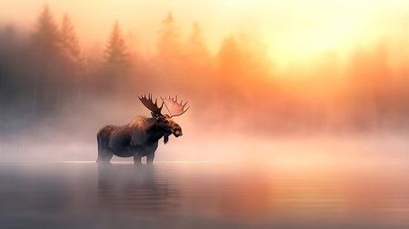Moose in a foggy forest at sunrise. 3d render