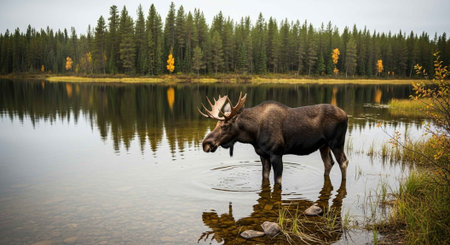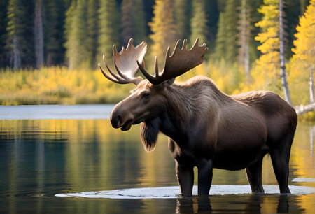 Majestic moose standing by a tranquil lake surrounded by autumn colors