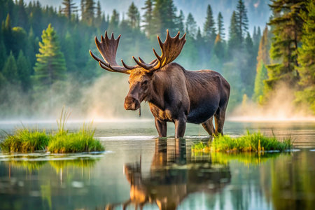A majestic moose standing in a misty lake, its impressive antlers and large frame reflecting in the calm water of the early morning.