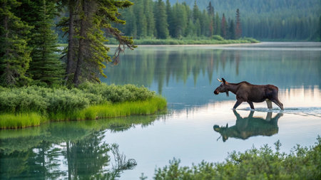 Beautiful moose walking forest lake nature wallpaper AI Generated Image
