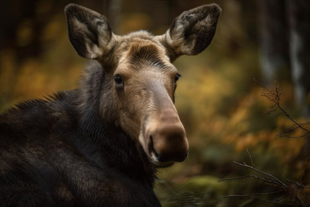A majestic moose stands gracefully in an autumn forest, showcasing its impressive antlers amidst colorful foliage, epitomizing natural beauty and wildlife serenity.