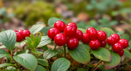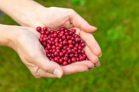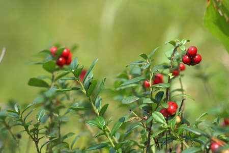 Red berries in the wild northern forest. Close-up of cranberries with green leaves on a green blurred background.