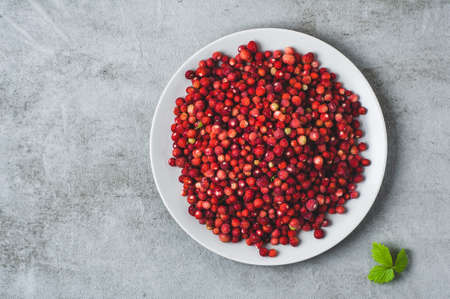 Wild strawberries in a grey ceramic plate over grey concrete background