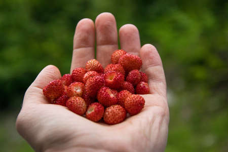 Red forest berries in a child's palm. Ripe lingonberries in a basket in the background. Forest berry collection concept. Selective focus on the palm with berries.