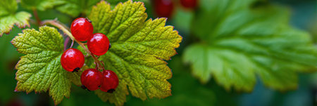 Juicy ripe red berries of red-flowering currant hanging on branch of bush with green leaves in garden. Vitamins, summertime, harvest, preservation, vegetarian, nature concept. Soft focus, copy space.