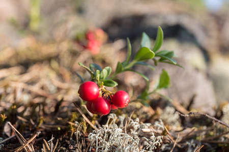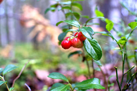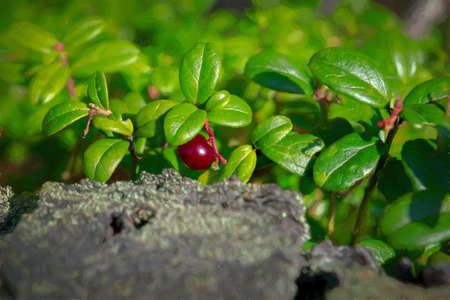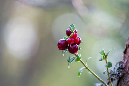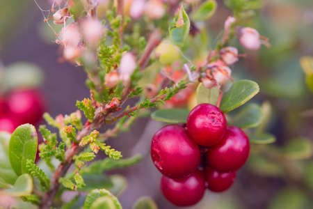 Ripe lingonberry growing in the forest close-up, macro photography. The concept of wild plants, healthy organic food, vitamins, gifts of the forest.