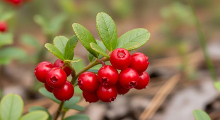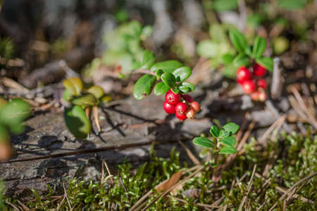 Vaccinium vitis-idaea (lingonberry, partridgeberry or cowberry). Fresh wild lingonberry in forest. Organic lingonberry.