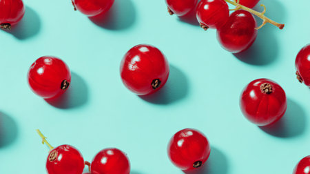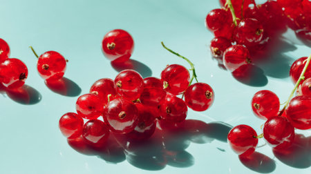 A visually appealing arrangement of fresh redcurrant berries on a light blue surface, showcasing their juicy texture and vibrant color under natural light. Perfect for culinary inspiration.