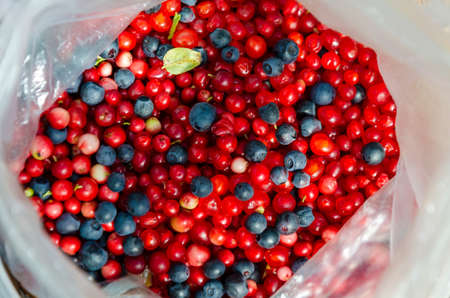 Berry background, texture. Bright, juicy fresh wild berry closeup. Fresh ripe blueberries and lingonberries. concept of harvesting wild berries in summer, nature, healthy nutrition, vitamins. top view