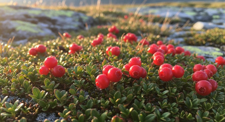 Large forest meadow covered by green small cowberry bushes with red ripe berries