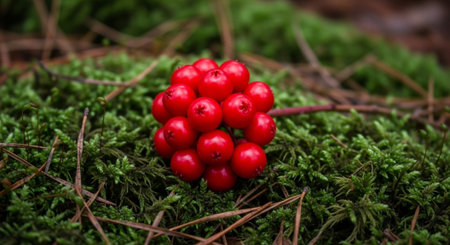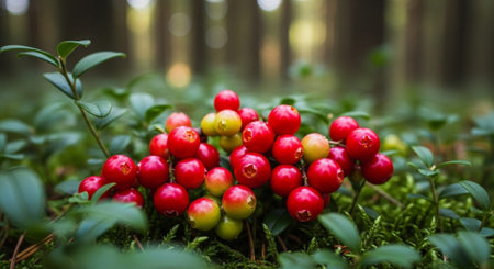 A close-up dark wide-angle view of a lingonberry (vaccinium vitis-idaea) bush in a taiga conifer woods with small lush leaves and vivid red berries with a northern moss and fir needles underlay