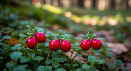 Ripe red cranberry berry grows in the forest. Beautiful natural background