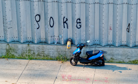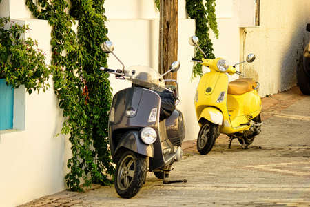 Crete, Greece - September 10, 2017: Vintage old 2 wheeler scooter of different color parked next to wall. Retro scooter parked on a street.