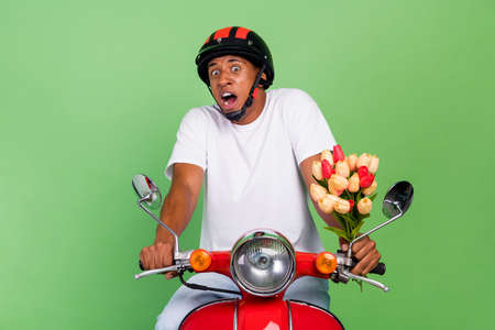Photo of young afro man afraid scared worried hold bunch of tulips ride motor bike isolated over green color background