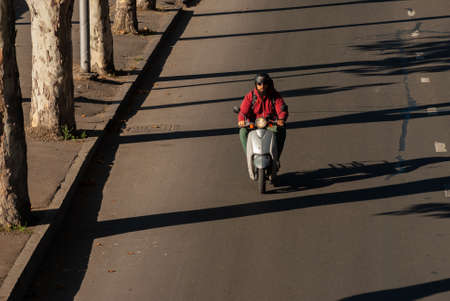 Seville Spain September 18, 2021 People rolling with a motorcycle in the streets of Seville, an emblematic city and the capital of the region of Andalusia, in the south of Spain