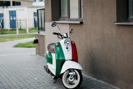 Riga, Latvia - October 8, 2020: a classic, elegant Vespa scooter parked on a pedestrian sidewalk in the city center street