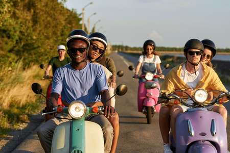 Exciting journey. Glad positive guy riding motorbike and smiling