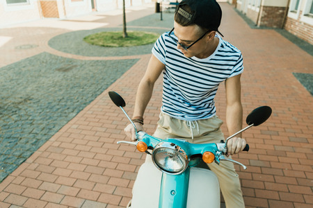 Smiling Young Man Riding Motor Scooter in the city. Speed motion blur concept.