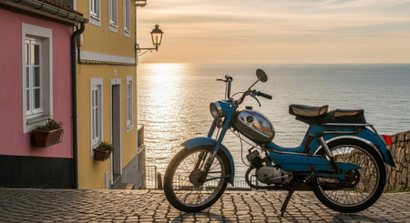 A vintage scooter stands alone on a misty cobblestone street, bathed in soft sunlight as dawn breaks through the fog. The scene evokes tranquility and nostalgia.