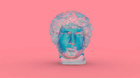 The head of Antinous in the guise of Bacchus in soft glass liquid multi layer transperent blue color on a pink background 3d rendering image
