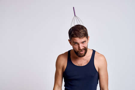 man with a massager for the head and in a blue t-shirt on a light background relaxing beard emotions