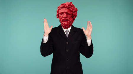 Plaster bust of David in a snowdrift on turquoise background. minimal layout