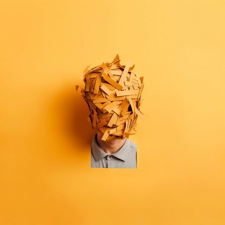 A creative sculpture depicts a human head made of plaster topped with crumpled paper that symbolizes chaotic thoughts. The scene is well lit emphasizing the unique artistry and texture.