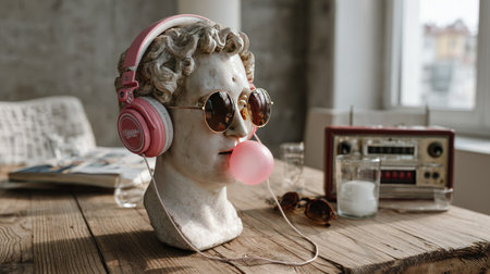 A whimsical bust sculpture adorned with oversized sunglasses and pink headphones, blowing a vibrant bubble gum, beautifully contrasts modern decor elements.