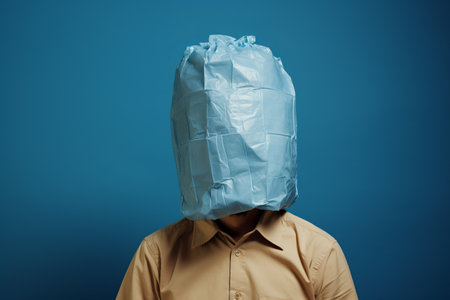 Pure white antique style Grecian or Roman bust with fronds with a taped mouth over blue in a conceptual image with copy space in square format