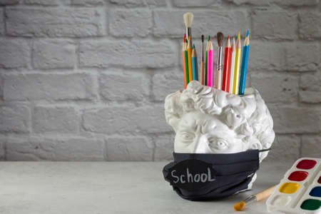 Back to school. Plaster stand of David's head for office and school supplies on a light background. Hygiene and protection against bacteria and viruses. Copy space.