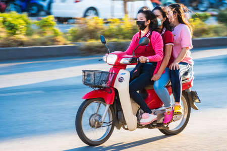 Beautiful young girl asian carrying bag to school riding motorcycle
