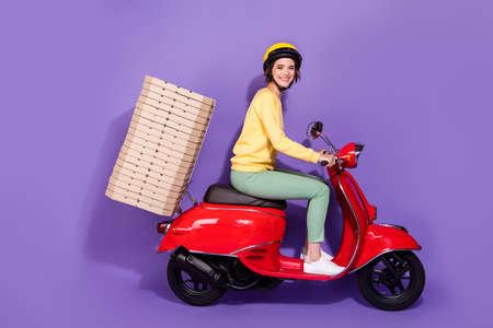 Full body profile side photo of courier girl drive scooter deliver pizza pie isolated over violet color background