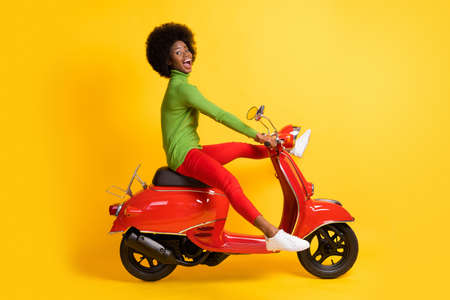Photo portrait of excited african american woman driving a red scooter with legs spread wearing casual outfit isolated on vivid yellow colored background