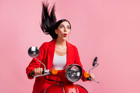Full length body size view of her she nice attractive lovely crazy amazed cheerful cheery girl sitting on moped fooling having fun time isolated on bright vivid shine vibrant red color background