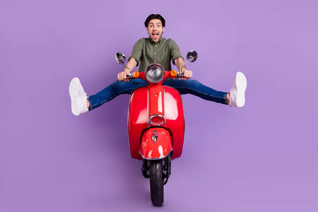 Full length photo of positive cheerful crazy young man ride bike enjoy speed isolated on purple color background
