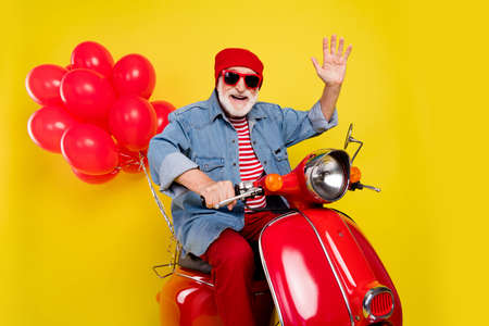 Portrait of elderly retired pensioner cheery man riding moped with festal balls waving hi isolated over vivid yellow color background