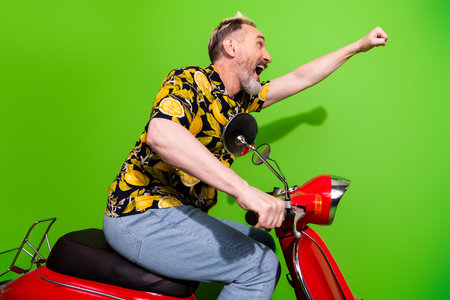 Mature man with a funky lemon print shirt enthusiastically riding a red scooter against a vibrant green background