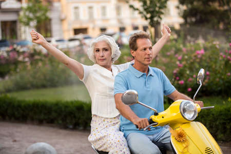 Mature couple on a scooter. Woman with raised hands. Go on a trip together. Feeling of freedom.