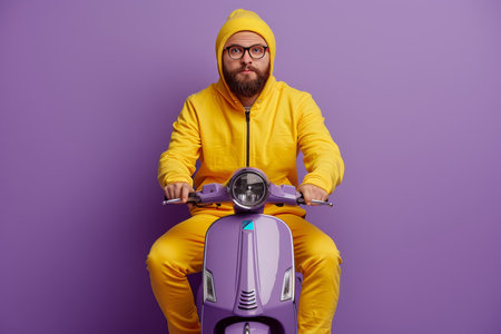 A man in a bright yellow tracksuit and glasses sits on a stylish purple scooter. The vibrant lavender background enhances the playful and youthful vibe of the setting..